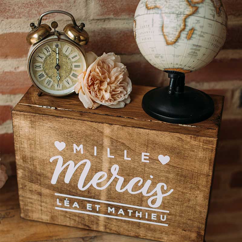 Vous démarrez dans la vie ou cela fait déjà quelque temps que vous êtes installés avec votre chéri? Peu importe, un petit coup de main de la part de vos convives est toujours apprécié. Si vous faites une liste de mariage dans un commerce, ne vous y prenez pas trop tard afin de choisir vos articles. Vous avez déjà tout ce qu’il vous faut? Alors prévoyez une urne que vous disposerez dans la salle, une jolie boîte que vous personnaliserez en accord avec le reste de votre décoration où vos invités pourront glisser une enveloppe.