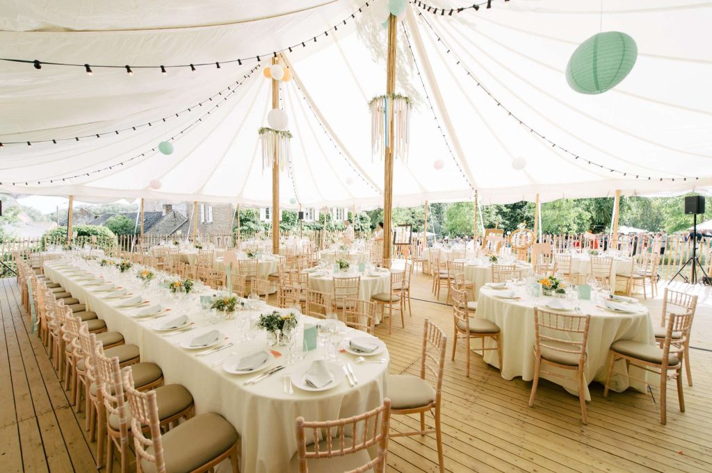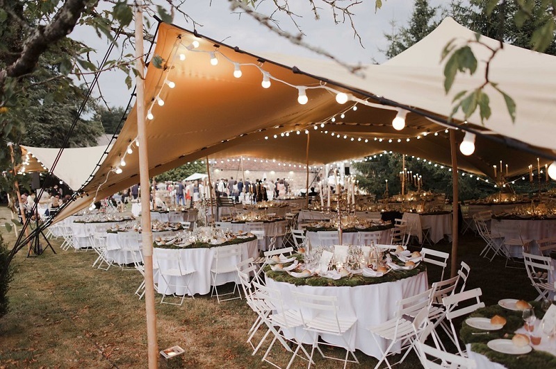 Un mariage au milieu d’un pré n’est pas toujours adapté aux robes et talons hauts des dames, prévoyez donc, sous votre tente par exemple, un revêtement stable comme un plancher ou il sera plus aisé pour vos invités ( ainsi que les serveurs s’il y en a) de se déplacer. Pour le soir, lorsque la fraîcheur s’installe, pensez aux chauffages ou encore des plaids dans lesquels vos convives pourront s’emmitoufler. Pensez également à l’éclairage qui se doit d’être en suffisance lorsque le soleil se couchera : ne lésinez pas sur les guirlandes et lampions 😉 sous la tente mais également dans les arbres se trouvant aux alentours.